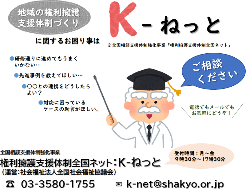 K-ねっとの相談事業は、どの地域においても、権利擁護支援を必要とする人が適切に成年後見制度等を利用できるよう、全国的な体制整備を後押しすることを目的としています。