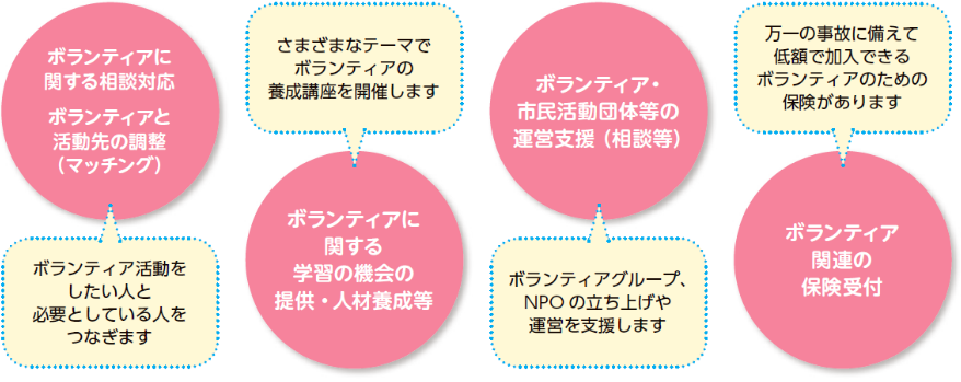 社会福祉協議会のボランティア・市民活動センターでは、ボランティア活動に参加したい人と、ボランティアの支援を必要としている人をつなげます。また、ボランティア・市民活動のきっかけづくり、活動に必要な知識や技術を学ぶための講座や研修会の開催、ボランティアグループ、NPOの立ち上げや運営の支援も行っています。