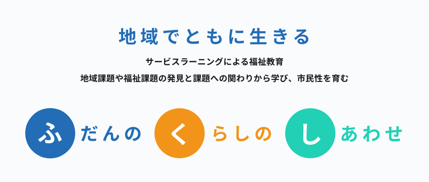 福祉はその単語の頭文字を使い研修などでは「ふだんのくらしのしあわせ」と紹介されることがあります。福祉教育は、ふだんのくらしのしあわせをつくるための学びです。最近は、身の回りの人々や地域との関わりのなかから、「ふだんのくらし」のなかにどのような福祉的課題があるかを自ら学び、課題を解決する方法を考え、解決のために行動する力を養うことで、ともに生きる力を育むことを目的としています。
